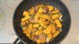 肉詰めピーマンならぬ、肉詰めかぼちゃ。子どもも大好きボリュームメニューです。ソースの隠し味はみりん