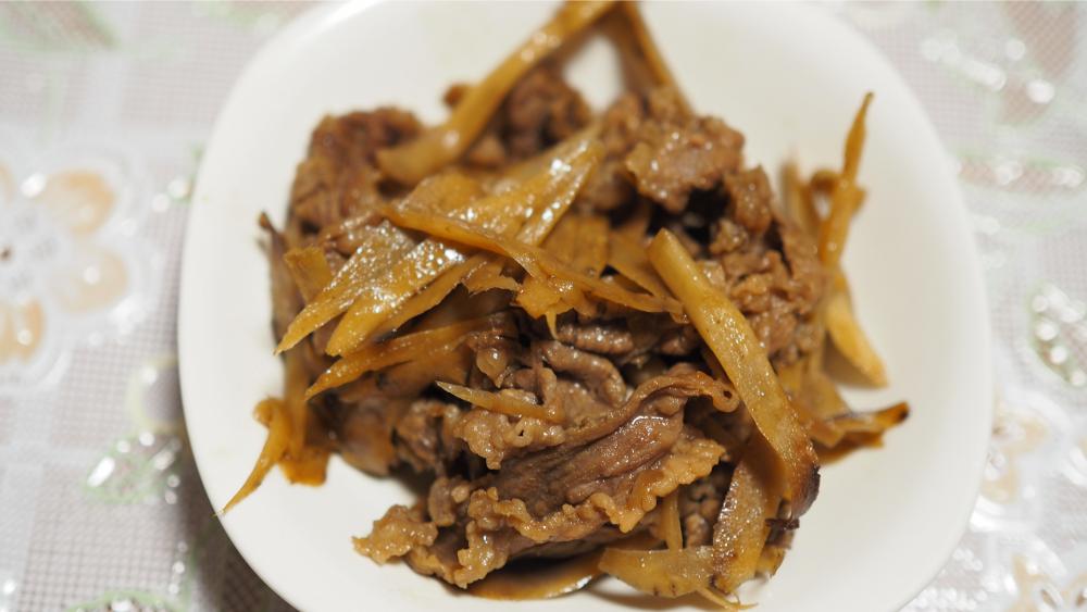 甘辛い煮物は、みんな大好き!味を含んでやわらかく煮えたごぼうと、みずみずしい豆苗が牛肉を引き立てます。