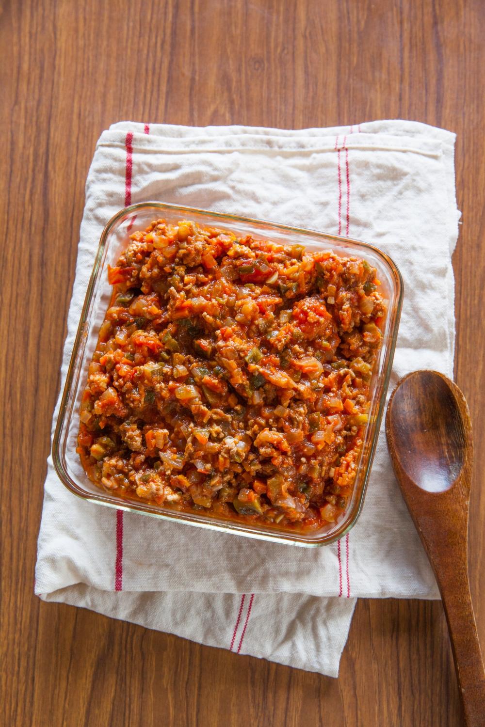 - たまねぎの色が透き通ってきたら、合いびき肉を加え、刻んだトマト、トマトケチャップ、中濃ソースを入れて汁気が少なくなるまで煮詰めれば完成!