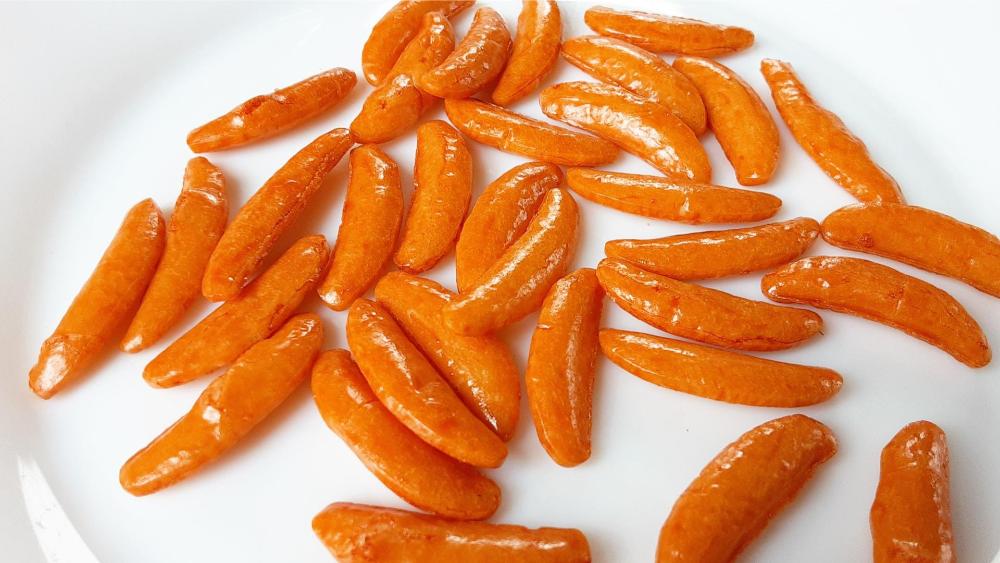 1. 柿の種をポリ袋に入れ、麺棒などで細かく砕く。