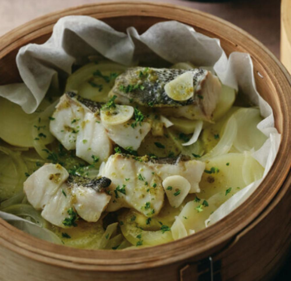 2.せいろにオーブン用の紙を敷き、じゃがいも、たまねぎを順に並べて塩少々をふる。上にたらをのせ、にんにくを散らし、バター10gをちぎってのせる。Aを回しかける。
