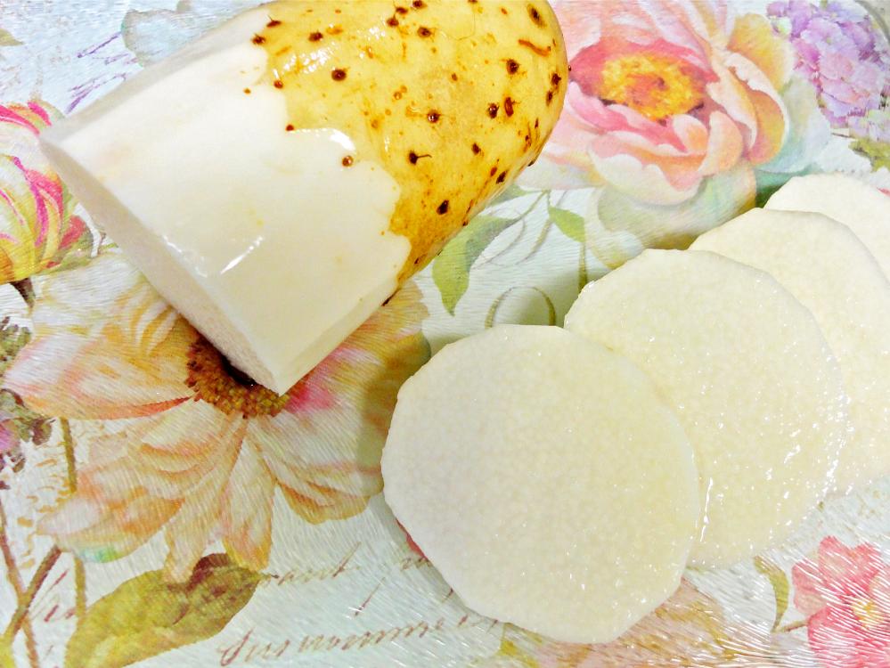 - 長芋は、持ち手として皮を3~4cm残してむく。半量分をスライサーでスライスしながら「2」の上に広げる。