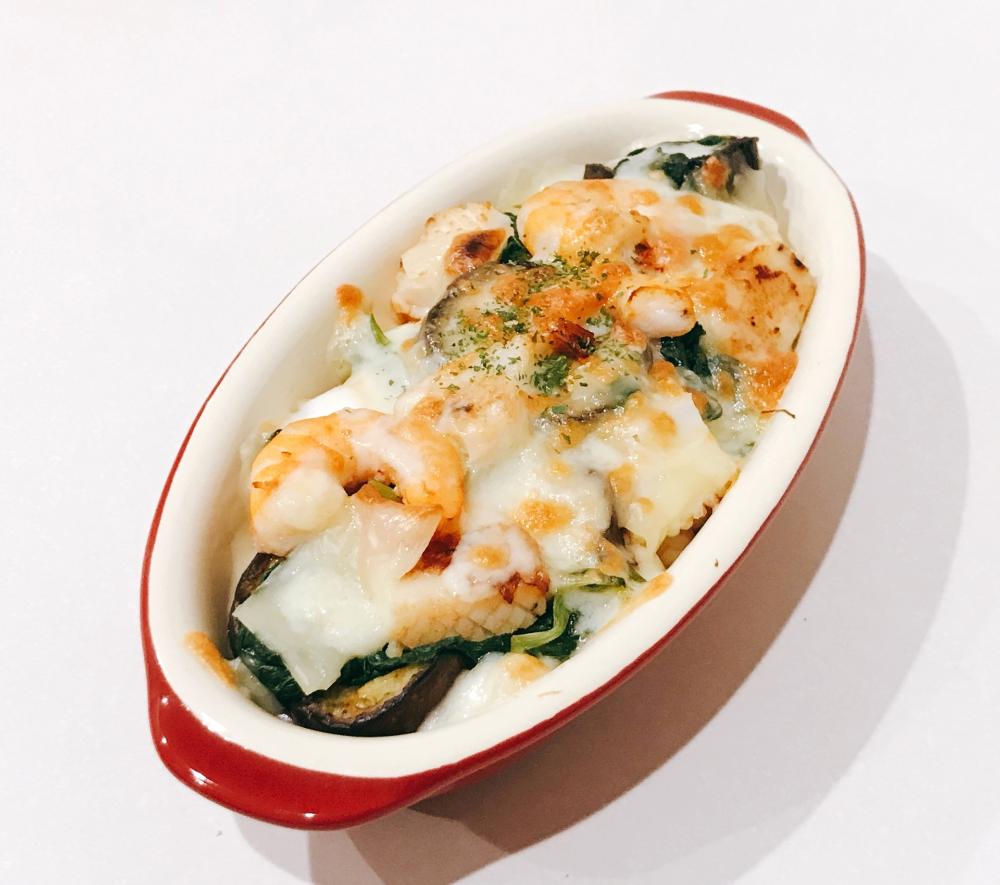 黒こしょうをふり、チーズはすりおろしてかける。230℃のオーブンの上段に入れ、約10分間、こんがりと焼き色がつくまで焼けば完成!