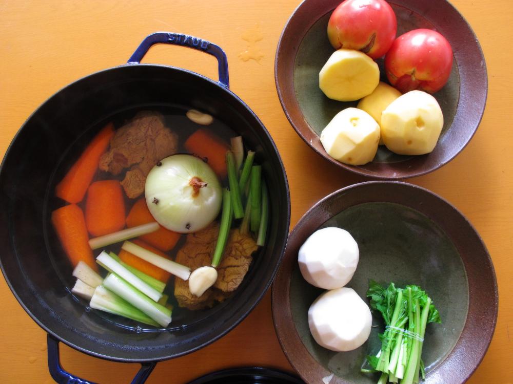 1. 「3」のかぶ、にんじん、じゃがいもを「2」の鍋に加えて強火にし、沸いたらごく弱火にして約30分間煮る。