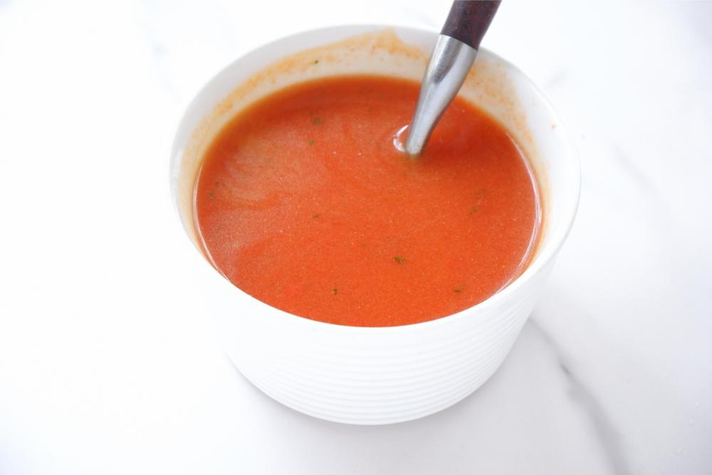 - 容器またはボウルにミニトマト、バジル、塩、こしょうを入れ、ハンドミキサー(ミキサー、フードプロセッサーでも可)でかくはんし、ジュース状にする。