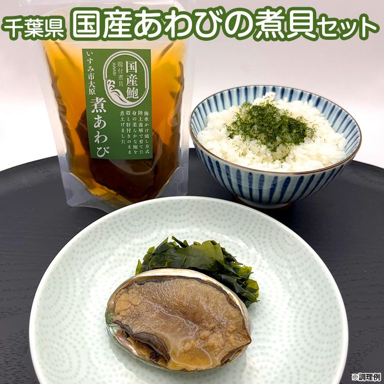 養殖あわびを肝付きのまま煮貝にした「国産あわびの煮貝」2つと、栄養分が豊富なあわびの養殖用水で育てられた青のりを加工した「糸青のり 粉」1袋のセット。