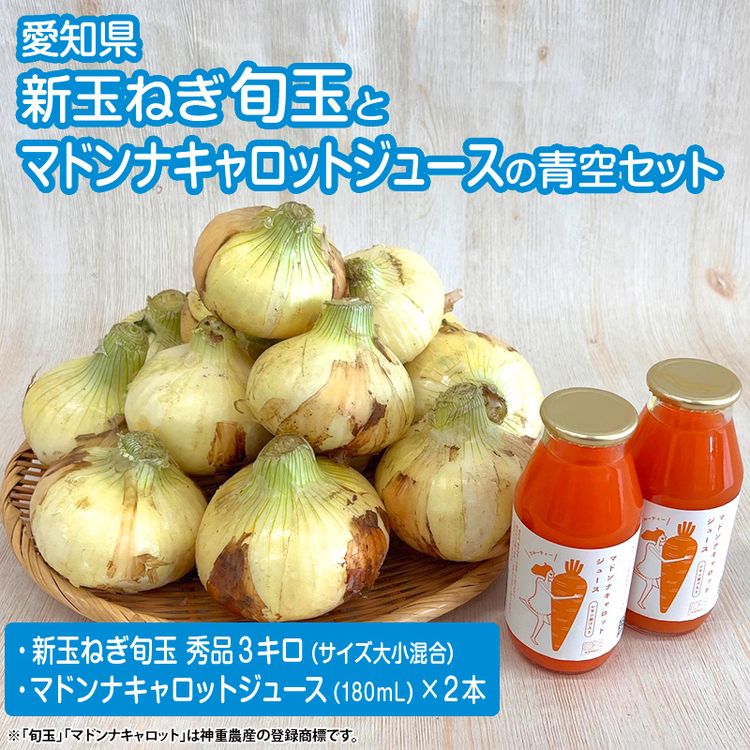 セットには『新玉ねぎ旬玉』と農園で育てた甘い人参を使った『マドンナキャロットジュース』が入っています。