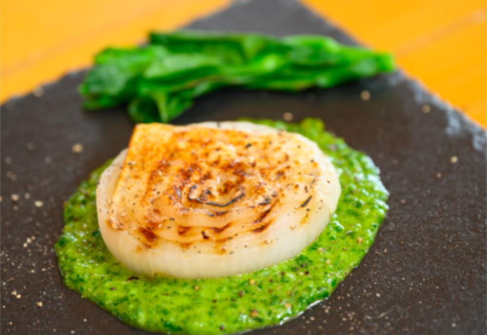 - 器に菜の花ソースを広げ、その上に焼いた旬玉をのせる。