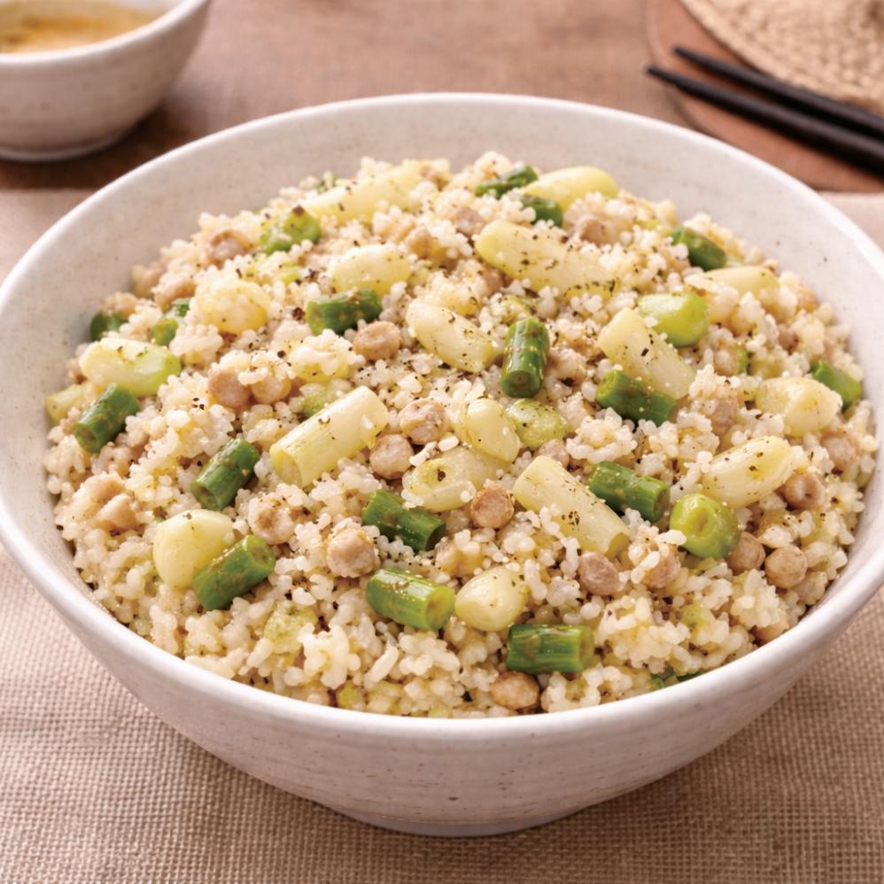 旬を迎えたアスパラガスの豊かな甘みと香りを余すことなく味わえる、贅沢な炊き込みごはんです。下ゆでして冷ましたアスパラガスのゆで汁は、そのまま旨みたっぷりの「アスパラだし」に。そこへ鶏ひき肉を加えてごはんを炊き上げることで、アスパラのやさしい風味と鶏肉のコク深いだしが重なり合い、ひと口ごとに広がる絶妙なハーモニーを楽しめます。
