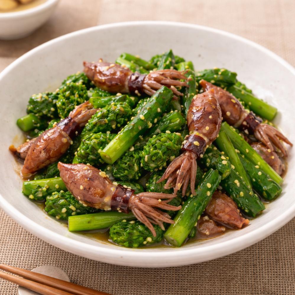 菜の花をサッとゆでて、しょうゆ・オリーブ油・からしでホタルイカとあえるだけ。春ならではの味わいです。