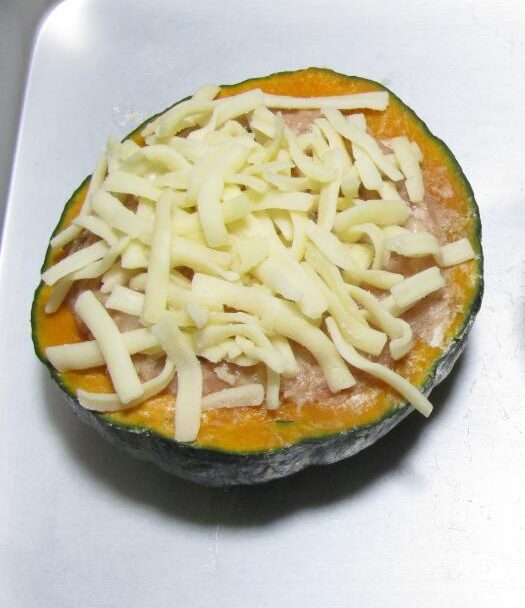 - ①のざく切りかぼちゃをマッシュし(食感が残るぐらいの粗い感じのマッシュ)、そこに⑤を混ぜ合わせてかぼちゃの器に詰め、トースターで10分ほど焼く。